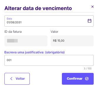 Para alterar a data de vencimento das faturas que ainda não foram geradas pagamento: status em aberto. E faturas que já foram geradas para pagamento: Status pendente, atrasado, inadimplente.
