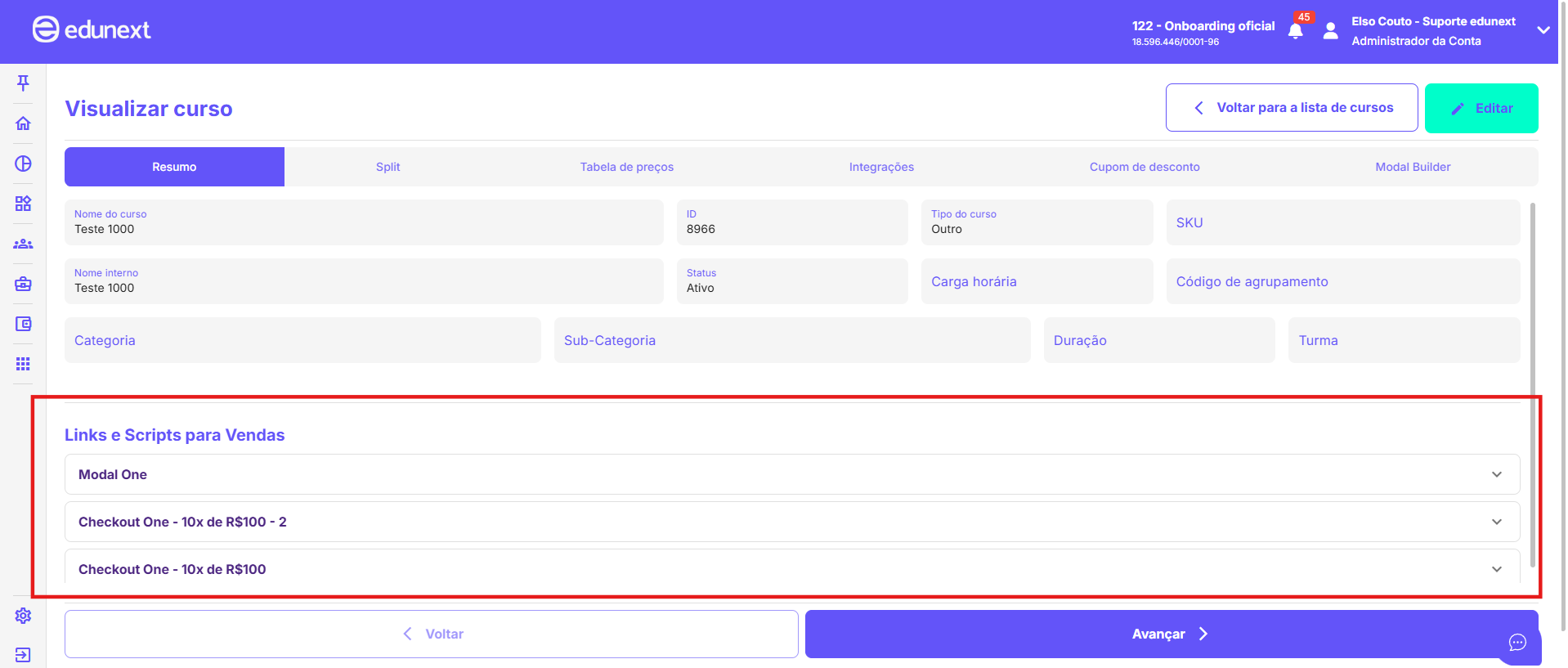 Na página de resumo, encontre as opções do Modal One e dos Checkouts One criados para o curso.