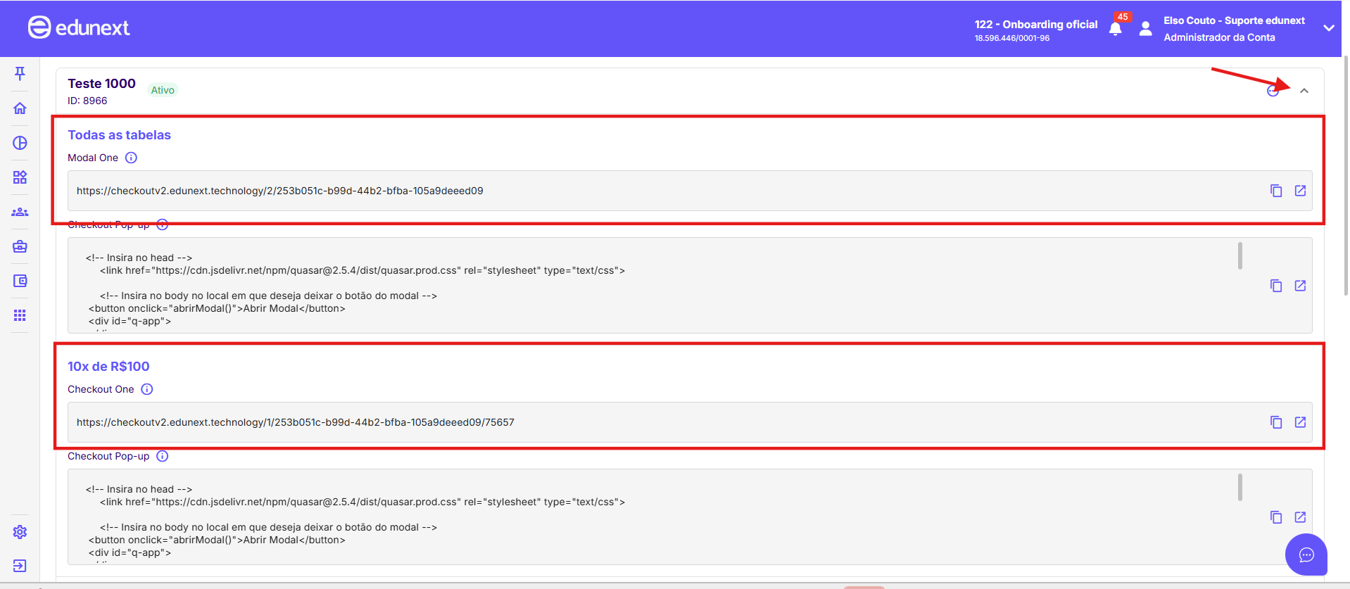 Clique no botão expandir para visualizar os links do Modal One e Checkout One.