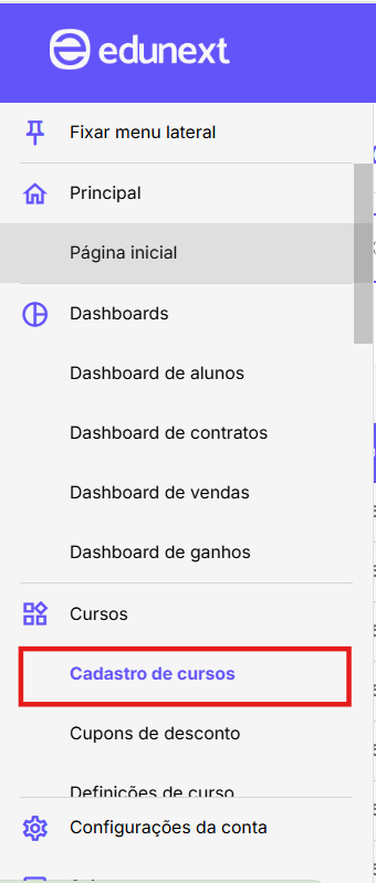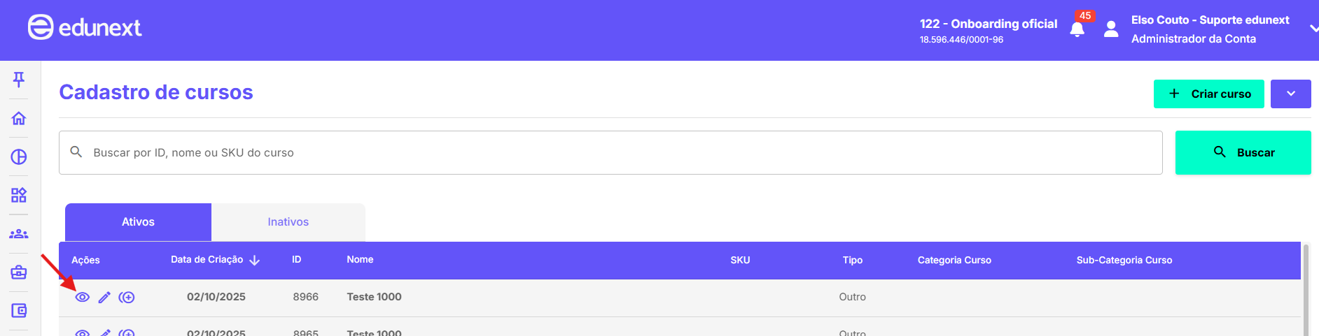 Acesse o Painel de Cadastro de Cursos na edunext e localize o curso desejado.