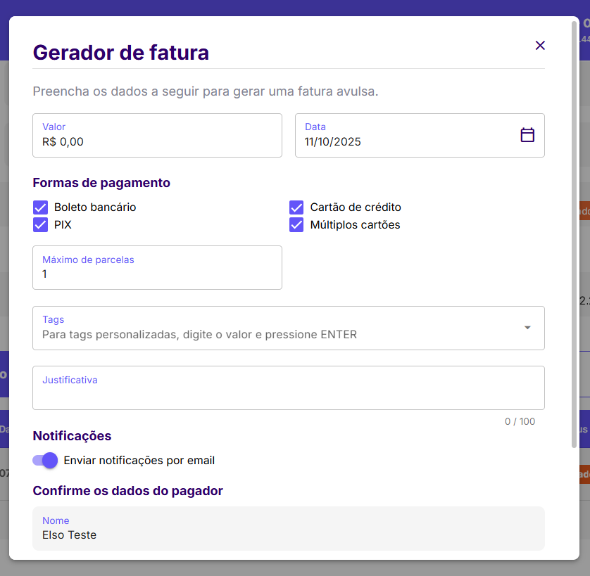Escreva uma justificativa e clique no botão Gerar fatura.