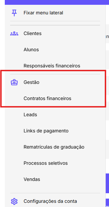 Primeiro, vá até a área de Gestão, localizada no menu à esquerda e clique na opção Contratos financeiros.