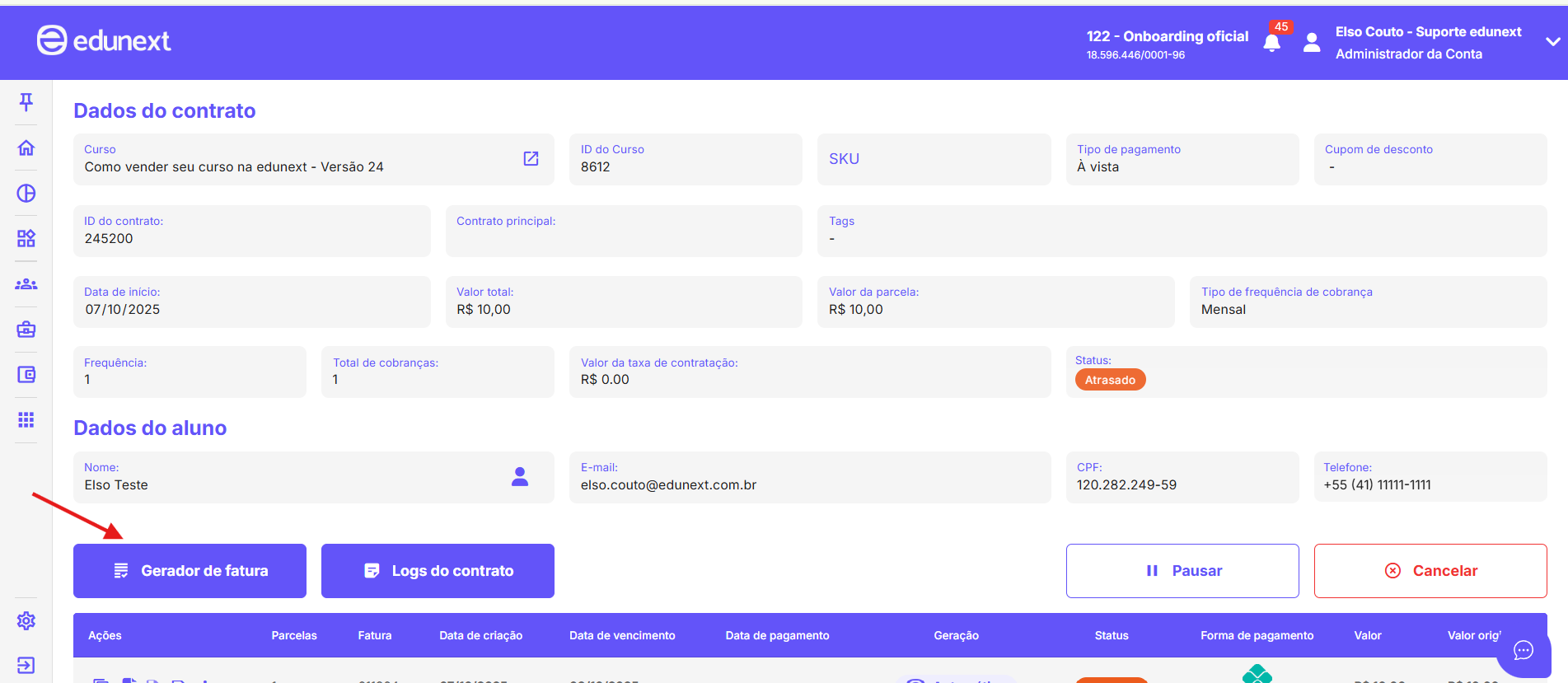 A primeira fatura de um contrato financeiro na edunext